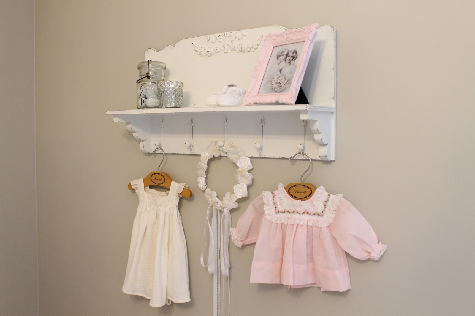 The shabby, chic shelf was another find off etsy. I think the dress on the right is what we plan on bringing her home in from the hospital. It was the dress that my dad picked out for me to wear home in after I was born. The veil in the middle was from my First Communion, and my flower girl wore in our wedding. The dress on the left was just a cute one I got from Gap. :) Don't worry about the vintage girls in the pink frame. They creep out Weston. I just like the frame, and I plan on putting a picture of our cutie in there one day.